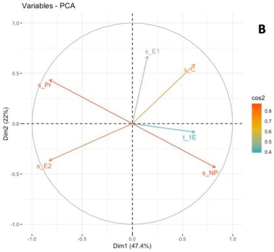 Principal component analysis (PCA) for the aphid trophic behavior by EPG study. Individuals factor map indicating the scores of aphids A. pisum feeding on six Pisum genotypes. The circles show the confidence ellipses (with a confidence level of 0.95) calculated with the barycenter of individuals for each parameter on the factorial plan. (A) PCA of individuals of pea biotype (ArPo28) probing on Pisum genotypes, (B) Variables factor map indicates the spatial ordination using five parameters: s_NP, total non-probing duration; s_C, total pathway phase; s_Pr, total probing duration; s_E1 total salivation duration; s_E2, total phloem ingestion duration; and t > 1 E, time to first phloem phase.