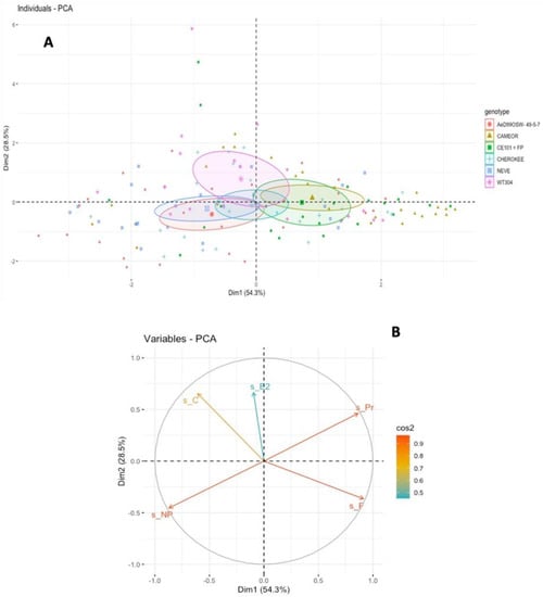Principal component analysis (PCA) for the aphid trophic behavior by EPG study. Individuals factor map indicating the scores of aphids A. pisum feeding on six Pisum genotypes. The circles show the confidence ellipses (with a confidence level of 0.95) calculated with the barycenter of individuals for each parameter on the factorial plan. (A) PCA of individuals of alfalfa biotype (LSR1) probing on Pisum genotypes. (B) Variables factor map indicates the spatial ordination using five parameters: s_NP, total non-probing duration; s_C, total pathway phase; s_Pr, total probing duration; s_F, total stylets derailment duration; and s_E2, total phloem ingestion duration.