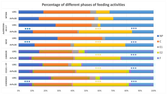 Percentage of the different phases of feeding activities during 8 h EPG recordings of pea biotype (ArPo28) and alfalfa biotype (LSR1) on P. fulvum (WT304) and on the different P. sativum genotypes (NP, non-probing; C, pathway; E1, phloem salivation; E2, phloem sap ingestion; F, derailment). Pairwise comparisons using Wilcoxon rank sum test with continuity correction were carried out (Mann–Whitney U test) and asterisks indicate a significant difference, *** p < 0.001.