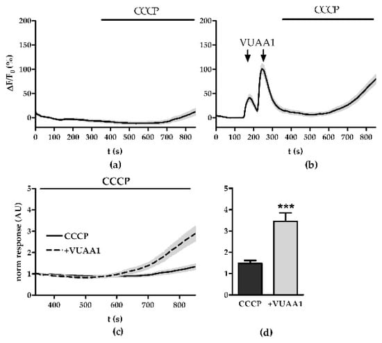 CCCP can release mitochondrial Ca2+ imported due to OR activity: (a,b) averaged time course of the change in Ca2+ fluorescence intensity ΔF/F0 in OSNs evoked by application of 1 µM CCCP under control conditions (a) or after a double stimulation with 30 µM VUAA1 (b, arrows); (c) comparison of normalized increase in Ca2+ fluorescence responses of OSNs with and without previous VUAA stimulation; (d) terminal Ca2+ responses from (c). Data represent mean ± SEM (CCCP, n = 48, CCCP + VUAA1, n = 49), Student’s unpaired t-test, *** p < 0.001.