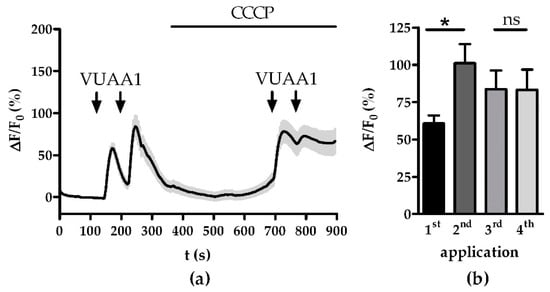 Sensitization of Orco channels is abolished by the disturbance of Ca2+ homeostasis by CCCP: (a) averaged time course of Ca2+ fluorescence responses to two sets of stimulations with 30 µM VUAA1 (arrows); (b) maximum Ca2+ responses for VUAA1 stimulations from (a). Data represent mean ± SEM (n = 28), Student’s paired t-test, ns, not significant, * p < 0.05.