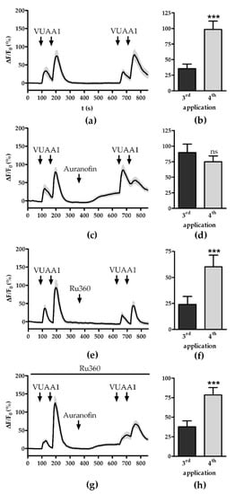 Next, we assessed if activation and inactivation of specific Ca2+ export and import pathways can have similar effects as impairment of Ca2+ homeostasis. Mitochondria can form the mPTP as a channel to release large quantities of Ca2+ at once []. Activation of the mPTP using auranofin led to a continuous increase in the fluorescence baseline to 21.2 ± 4.7% compared to 0.02 ± 2.6% in the control measurement (Figure 3a,c). Similar to treatment with CCCP, auranofin application abolished the increase in fluorescence intensity of the secondary VUAA1 pulse (Figure 3c). After subtraction of the background, the intensity of the secondary pulse dropped by 50 ± 14.6%, mirroring the CCCP results.