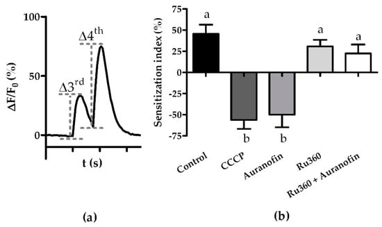 Effect of modulators of mitochondrial Ca2+ import and export on sensitization index: (a) Sensitization efficacy was quantitatively assessed by calculating the “Sensitization Index” []. After subtraction of the baseline fluorescence intensity before the delivery of the VUAA1 stimulation, the Sensitization Index was calculated as the difference between the intensity of the fourth and third stimulation (Δ4th-Δ3rd); (b) sensitization Indices after treatment with modulators of mitochondrial Ca2+ import and export calculated as described in (a). Data represent mean ± SEM, different letters above the bars indicate significant differences (p < 0.05) as revealed by Tukey-Kramer post hoc multiple comparison tests.