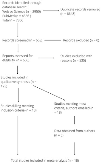 All studies were screened for relevance to the meta-analysis and scored based on the following system: (1) studies meeting all inclusion criteria (Figure 1), (2) studies meeting all the inclusion except for some of the needed components for the meta-analysis, (3) qualitatively relevant studies without the necessary data, or (4) studies that were irrelevant. Authors were emailed from category 2 to see if they were willing to share their data with us for the purposes of this study. If the authors did not respond after two emails, their studies were excluded from the analysis. The final number of studies included in the meta-analysis was 18, and 123 studies were included in the qualitative review (Figure 2).