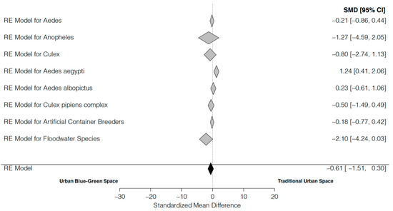 When combining all of the mosquito species together, the mixed effects model found no difference in relative mosquito abundance between blue-green spaces versus urban spaces (Figure 3). The results of the analysis suggest that the fear of blue-green spaces increasing relative mosquito abundance overall is largely unfounded. However, our analysis did suggest that floodwater species (e.g., Aedes vexans) tended to be more abundant in blue-green spaces, but the difference was not significant. We did not have a sufficient number of studies to conduct the meta-analysis on each individual mosquito species, but Ae. aegypti abundance was significantly higher in traditional urban areas compared to BGSs. Our results are consistent with previous findings that have shown urban BGSs having a variety of effects on mosquito relative abundance [12,15,17,18,19,20,21,22], which may be based on differences in species’ ecologies and the variation present in size and structure of urban BGSs.