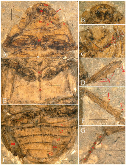 Legs (Figure 2A,B and Figure 3A,D–H) strong. Protibia (Figure 3D) gradually widened apically and with 3–4 teeth along outer margin, gradually larger apically, apex bifurcate, short, nearly right angle. Mesotibia (Figure 3F,G) with one large tooth on outer margin and at least one long and sharp spur at apex. Metacoxa, metafemur and metatibia (Figure 3H) burly.