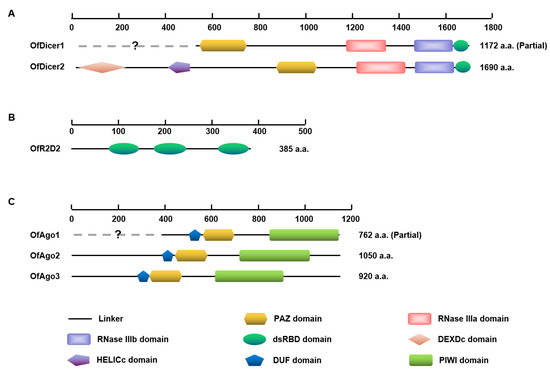 Domain analysis showed that almost all predicted OfAgo proteins contained common domains including DUF, PAZ, and PIWI. OfDicer2 contained each of DEXDc, HELICc, PAZ, RNase IIIa, RNase IIIb, and dsRBD domains, whereas the DEXDc and HELICc domains are absent in OfDicer1, probably due to the partial sequences in the database. In contrast, OfR2D2 contained three dsRBD domains (Figure 1). The PAZ domain are specialized to bind RNA ends, especially duplex ends with short (approximately 2 nt) 3′ overhangs in Ago proteins, and the PIWI domain is unique to the Argonaute superfamily. The PAZ and RNase III domains play central roles in excising siRNAs preferentially from ends of dsRNA molecules in Dicer proteins. The function of dsRBD is to bind dsRNA [29].
