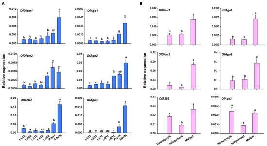 Tissue-specific expression profiles in L5D2 larvae showed that core RNAi pathway genes were expressed in all tissues investigated. OfAgo1, OfAgo2, OfDicer1, and OfDicer2 were highly expressed in the midgut, whereas OfAgo3 and OfR2D2 displayed highest expression in the hemolymph and midgut (Figure 2B).