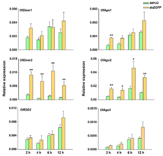 RT-qPCR analyses of relative expression of Dicer1, Dicer2, Ago1, Ago2, Ago3, and R2D2 in O. furnacalis at different time-points after each larva was injected with 5 μg dsEGFP. ddH2O was injected in the negative control. Each treatment consisted of five replicates and three individuals were pooled in each replicate. Student’s t-test was used in statistical analysis of the data (*, p < 0.05, **, p < 0.01).