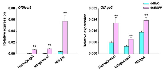 Since the expression of OfDicer2 and OfAgo2 was up-regulated for a long time after injection of dsEGFP, we evaluated the expression levels of OfDicer2 and OfAgo2 in three different tissues including hemolymph, integument, and midgut by RT-qPCR. Our results showed that the expression level for OfDicer2 in the hemolymph, integument, and midgut increased by 9.7-, 11.0-, and 13.5-fold, respectively, whereas the expression level of OfAgo2 increased in the hemolymph, integument, and midgut by 2.8-, 2.0-, and 1.5-fold, respectively (Figure 4).