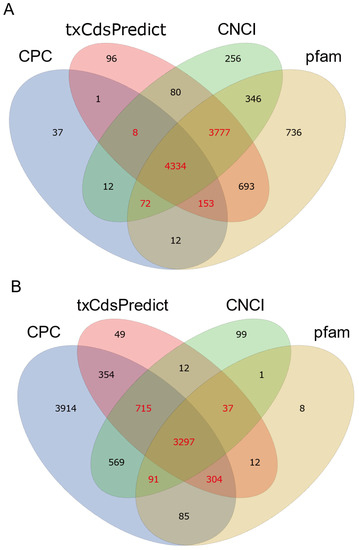 Venn diagram of the novel lncRNAs (A) and mRNAs (B) by coding capacity analysis using four methods. CPC: Coding Potential Calculator; txCdsPredict: part tool of UCSC Genome Browser; CNCI: Coding-Noncoding Index; pfam: Pfam database. Specific LncRNAs and mRNAs were identified if consistently discovered by at least three of the methods and are shown in red.