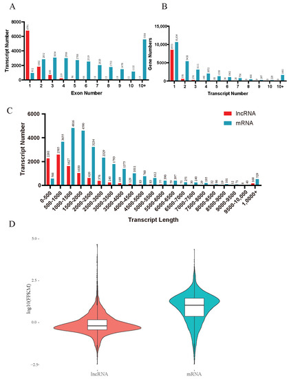 Protein-coding capacity analysis of the transcripts predicted that the control samples had an average of 7275 novel lncRNAs, 2630 novel mRNAs, 845 known lncRNAs, and 12,324 known mRNAs. The transcripts from the treated samples were predicted to have an average of 7130 novel lncRNAs, 2605 novel mRNAs, 814 known lncRNAs, and 12,276 known mRNAs (Table 3). These samples contained 8344 novel lncRNAs and 4444 novel mRNAs, as predicted by CPC, CNCI, txCdsPredict, and the Pfam database (Figure 1). Among the lncRNAs, characterization of their genomic locations revealed that 97% (9492) had a number of exons ranging from one to four, and 120 (3%) had at least five exons (Figure 2A). A total of 88% (8553) of the lncRNAs had only one transcript; none of them had more than nine transcripts (Figure 2B), and lncRNAs less than 2.5 kb in length accounted for 83% (8123) of the total (Figure 2C). To determine whether the T. castaneum lncRNAs had similar features, we measured the overall expression level (FPKM) of the lncRNAs and found that it was significantly lower than that of mRNAs in T. castaneum (Figure 2D).