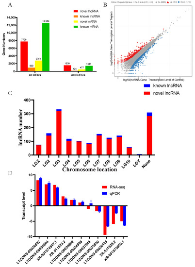 Numbers of identified differentially transcribed or expressed lncRNAs and mRNAs (A). (B) Scatter diagram showing differentially transcribed lncRNAs between the control and terpinen-4-ol treatment groups, where DEGs represent differentially transcribed or expressed lncRNAs and mRNA, and all SDEGs indicate significantly differentially transcribed or expressed lncRNAs and mRNA. (C) Chromosomal distribution of differentially transcribed lncRNAs, where the X-axis indicates the chromosome location of lncRNAs. None represents lncRNAs that matched with unplaced scaffolds. (D) Relative transcription of the lncRNAs validated RNA-seq data with qPCR, the X-axis indicates the lncRNAs.