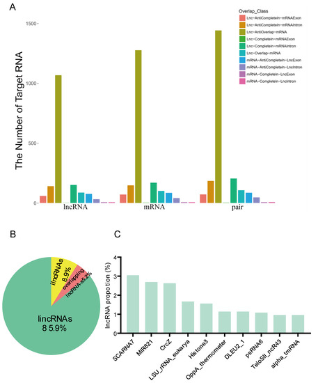 The function of lncRNAs is principally determined by cis and trans actions with respect to the target gene. In Table S3, 10 kb of the upstream or 20 kb of the downstream of the associated mRNA are shown. Our results revealed that 3788 lncRNAs affected 845 mRNAs upstream, including 1568 lncRNAs overlapping with 1846 mRNAs, and 4244 lncRNAs affected 4982 mRNAs downstream without any overlaps (Table S4). In the same chain, five lncRNAs were completely located in the exons of six mRNAs, and 153 lncRNAs were in the introns of 712 mRNAs. On the other chain, 62 and 143 lncRNAs were located in the exons of 74 mRNAs and the introns of 150 mRNAs, respectively (Figure 4A). lncRNAs were aligned into the Rfam database, and annotation detailed the families to which they belonged. LincRNA accounted for 85.9% of the total lncRNAs (Figure 4B), and we found that 16.88% of the lncRNAs that we identified belonged to the following families: SCARNA7, MIR821, CrcZ, LSU_rRNA_eukarya, Histone3, OppA_thermometer, DLEU2_1, psRNA6, TeloSII_ncR43, and alpha_tmRNA (Figure 4C).