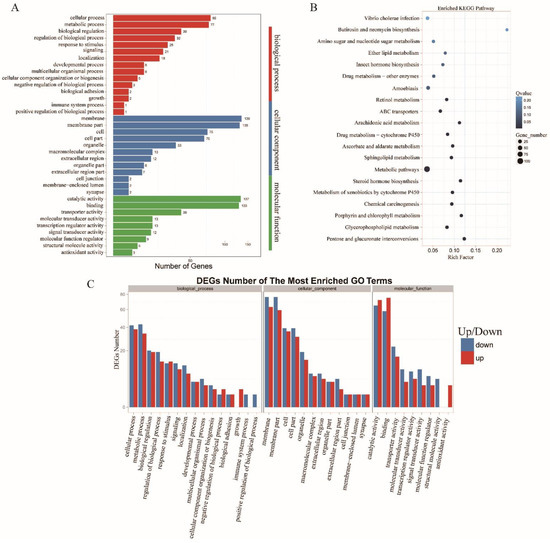 Statistical results from the GO enrichment, the Y-axis corresponds to the GO terms, the red histogram refers to biological processes, the blue is the cellular components, and green is molecular functions (A); KEGG pathways (B); and up- and down-regulated GO terms, where the X-axis indicates the different GO terms, down-regulation is shown in blue, and up-regulation is shown in red (C) of significant differential target mRNAs in Tribolium castaneum.