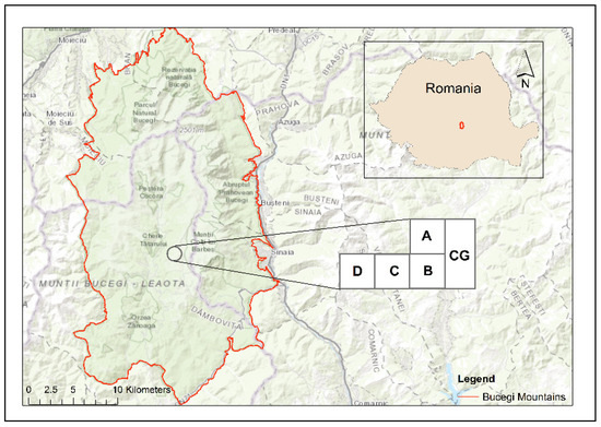 The research was carried out at the Mountain Grasslands Research Centre (MGRC) in the Bucegi Mountains, Romania, on gently sloping land situated at the base of Blana Peak (1875 m a.s.l.). The Bucegi Mountains are located on the east side of the Southern Carpathians, with an area of 300 km2. They have great structural and morphological complexities, with high peaks of altitudes between 1600 and 2500 m. The shape of the mountain range is that of an amphitheatre, with a wide opening on the south side (Figure 1).