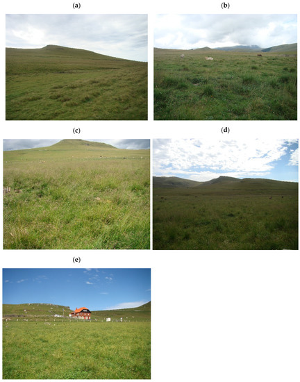 Figure 2. The general aspects of the investigated experimental plots from grassland ecosystems, Bucegi Mountains, Romania, 2017 ((a) control plot-grassland CG; (b) plot A; (c) plot B; (d) plot C; (e) plot D). - Plot B is a semi-natural pasture, located at 45°21′24.9″ N; 25°27′39.9″ E; at 1782 m altitude, with an eastern exposure, and no slope. The dominant plant species were D. cespitosa (L.) P. Beauv., P. alpinum L., Phleum pratense L., R. acris L., and T. repens L. It was chemically fertilised in 1996–1998 with an average application rate of 150 kg ha−1 N + 75 kg ha−1 P2O5 + 75 kg ha−1 K2O and organically fertilised in 2004, 2010, and 2016 by paddocking with dairy cows. Cattle manure was added as an input of organic matter (Figure 2c).