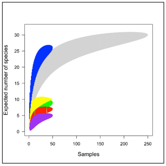 None of the species’ accumulation curves (for each treatment) approached an asymptote (Figure 3). This indicated that species were correlated with the sampling effort and that more samples were required to detect all of the taxa theoretically expected per treatment.