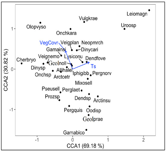 The global CCA model, which selected VegCovr and Ts as meaningful explanatory variables, was significant (p = 0.004). The majority of this variation was explained by the first axis, only the first canonical axis being significant (first axis F = 2.747, p = 0.004; second axis F = 1.224, p = 0.228). The first axis accounted for 69.18% and the second for 30.82% of the total variation, respectively, and both explained 13.40% of the total inertia in the overall mite species data. We highlighted 29 species (r ≥ +/−0.5), which significantly correlated with one or both of the first two CCA axes. Amongst these, Dendrolaelaps foveolatus and Lysigamasus conus were strongly correlated with Ts, and Veigaia planicola and Gamasellodes insignis with VegCovr (Figure 4).