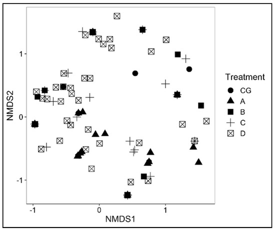 To examine mite community patterns in relation to treatment, we performed a non-metric multidimensional scaling (NMDS) ordination with a Bray–Curtis similarity index. To determine whether the treatments affect the mite communities, we used analysis of similarity (ANOSIM) with a Bray–Curtis similarity [65]. ANOSIM tests whether community differences among groups are significant by calculating a global R-statistic, which is an absolute measure of the distance between groups. An R-value close to 1 indicates strongly distinct assemblages, whereas an R-value approaching zero indicates that the assemblages are barely separable.