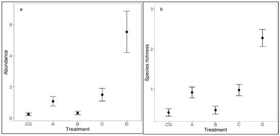 In total, 30 species with 1163 individuals were identified in all investigated experimental plots. The highest values of species richness and numerical abundance were obtained in plot D (26 species, with 584 individuals) and the lowest in CG (5 species, with 50 individuals) and in B (7 species, with 52 individuals) (Figure 6a,b).