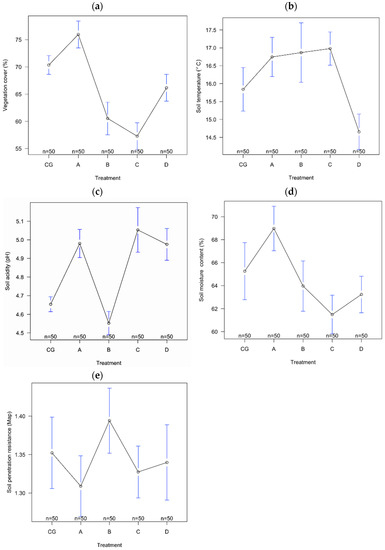 The Tukey multiple comparisons of means showed significant differences between CG and A, B, and C treatments for vegetation cover, between CG and A, C, and D for soil moisture content, and between CG and D for soil temperature (Table 5).