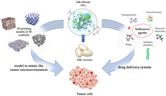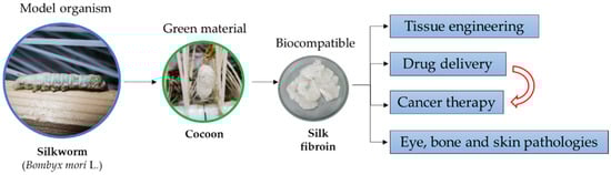 In recent years, numerous studies have been conducted focusing on the widespread use of SF as a functional biomaterial in the biomedical field. This review is expected to provide information on superior mechanical and biological properties of SF, the processing methods as a green material, recent advances in tissue engineering where SF plays a major role in mimicking the microenvironment of cells, and the importance of SF-based biomaterials used in drug delivery and cancer therapy. Figure 1 presents a schematic image of the main SF application.