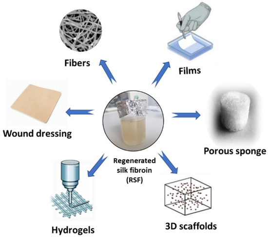 Among the multiple and complex applications of SF in tissue engineering, SF dressings are a viable and promising option for the improvement of wound healing strategies through tissue engineering techniques [14]. Through the use of SF in developing sponges [143], hydrogels [144,145], SF micro- and nanoparticles [146], nanofibrous matrices [147], scaffolds, and composite films [148], SF and its potential applications in tissue engineering have been intensely studied in the last few years.