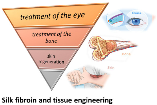 The purpose of tissue engineering is to combine cells with scaffold materials and growth factors in order to help the regeneration of or even replace damaged tissue and/or organs. The need for a biomaterial matrix that could aid in the development of viable and biologically active tissue, either in vivo or in vitro, has increased in the last few years [132]. It has been proven that SF stimulates the attachment and growth of human cells [133]; thus, it is not surprising that it became a Food and Drug Administration (FDA)-approved biomaterial that can successfully be used as a scaffold in tissue engineering due to its unique properties and complex structure [2].