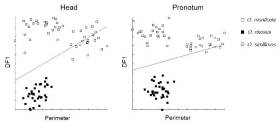 The allometric effect of the head size (perimeter) on head shape discrimination (DF1) was 19% for DF1 (p < 0.001, Figure 3) and 51% for DF2 (p < 0.001). The same analysis for the pronotum revealed a lower allometric effect (6%) for DF1 (p < 0.001, Figure 3) and for DF2 (46%, p < 0.001).