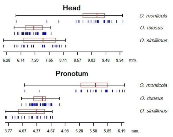 O. monticola exhibited the largest head (mean = 8.96 mm) and pronotum (mean = 5.55 mm) perimeter. The smallest head perimeter was observed in O. rixosus (mean = 7.17 mm), whereas the smallest pronotum was in O. simillimus (mean = 4.30 mm). All three species showed significant size differences for either the head or pronotum, except for O. rixosus and O. simillimus, who exhibited similar head size (Table 1, Figure 4).
