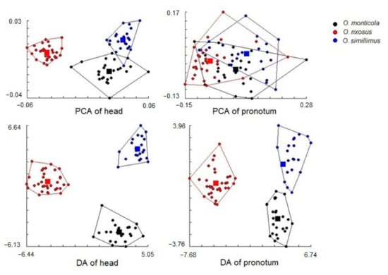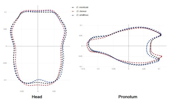 The mean shape superposition of the head and pronotum allowed us to highlight the areas where differences appeared between species. The posterior margin of the O. simillimus head contour was more curved than that of the other two species. The pronotum of O. simillimus also had a more curved shape than that of the other two species (Figure 5).