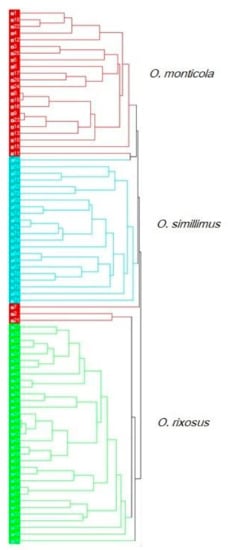 For the head contour, the principal components analyses showed almost non-overlapping clouds corresponding exactly to the initial grouping of species (Figure 6, top left). No such pattern was apparent for the pronotum, for which the three species largely overlapped (Figure 6, top right). For this reason, the exploratory data analysis was illustrated only for the head: it showed high agreement with pre-established hypotheses, except for three seemingly erratic individuals (4% of the total), all of them belonging to O. monticola (Figure 7).