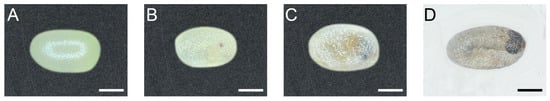The egg development and hatching process of P. xylostella. Scale bar = 200 μm. n = 33. (A) Stage I: Eggs were evenly white when they were just laid, and the egg chorion was full. (B) Stage II: Stemmata pigmentation. Pigmentation of the stemmata began with a red spot and then darkened and, finally, turned black. (C) Stage III: Head capsule pigmentation. The segmentation was complete at the moment. (D) Stage IV: The cuticular structures of the embryo have acquired their distinctive larval morphology, and the liquid in the eggs was fully absorbed.