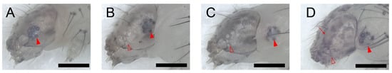 The larval–larval ecdysis of P. xylostella larva. The full red arrowheads point to the stemmata, and the hollow red ones point to the hollow stemmata on the old head capsule. The arrow points to the pigmented mandibles. Scale bar = 300 μm. n = 33 in L1–L2 ecdysis, n = 38 in L2–L3 ecdysis, and n = 53 in L3–L4 ecdysis. (A) Stage I: No significant change in its stemmata. (B) Stage II: Head capsule slip. Six stemmata on the old head capsule turned white and six “black spots” (stemmata pigment spots on the new head capsule) moved posteriorly, which means the head capsule moved anteriorly to the larva. (C) Stage III: Relative quiescence. All stemmata on the new head capsule have already emerged from the posterior side of the old head capsule in this stage. (D) Stage IV: Pigmentation of new mandibles.