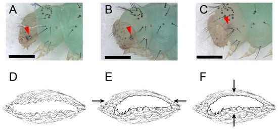 The larval–pupal metamorphosis and the tanning before the eclosion of P. xylostella. The full red arrowheads point to the stemmata pigment spots. Scale bar = 500 μm. n = 36. (A,D) Stage II: cocooning. There were a white bars among the stemmata on the head capsules of fourth instar larvae. There were no significant changes in the stemmata and the white bar at this stage. (B) Stage III: Head capsule slip. The head capsule slipped anteriorly and ventrally after cocooning. The stemmata pigments and the white bar progressively faded. (C) Stage IV: Stemmata moved out of the margin of the head capsule, merged as one pigment spot, and distinctly faded while the white bar was left inside the head capsule and almost vanished. (E) Pre-ecdysis I at stage IV. The arrows show the anterior-posterior contractions of the prepupa. (F) Pre-ecdysis II at stage IV. The arrows show the dorsal-ventral contractions of the prepupa.