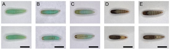 The morphological characters in egg development have been described in the dipteran insects Chrysomya megacephala [29] and Hermetia illucens [30] and the hemipteran insect Empoasca onukii [31]. In general, it consists of the chorion becoming dented and shriveled, embryo stemmata pigmentation, and segmentation. The following larval hatching is described in M. sexta [32].