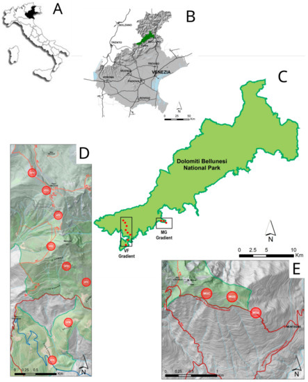 Maps of the research area: (A): Position of Veneto Region inside Italy; (B): Position of Dolomiti Bellunesi National Park in the Veneto Region; (C): Locations of the two altitudinal gradients in the Dolomiti Bellunesi National Park; (D,E) position of plot along the two altitudinal gradients (respectively, Vette Feltrine—VF—and Mount Grave—MG.