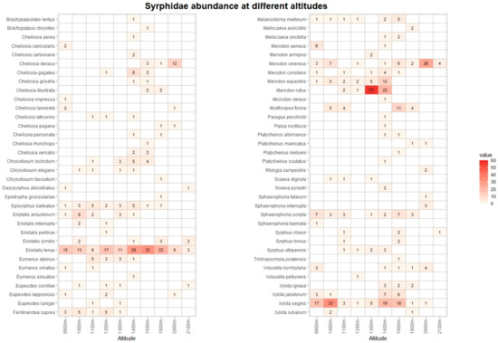 Heatmap with list of Syrphidae species and their abundance at different altitudes. The data from Vette Feltrine and Mount Grave are pooled. The intensity of color is proportional to specimen abundance.