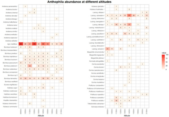 Heatmap with list of Anthophila species and their abunance at different altitudes. The data from Vette Feltrine and Mount Grave are pooled. The intensity of color is proportional to specimen abundance.