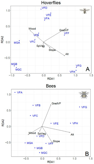 A db-RDA was also applied to ecological categories of hoverflies and bees. For hoverflies, the following categories were used: larval trophic habitus (three categories: zoophagous, saprophagous, phytophagous); larval microhabitat association (five categories: tree foliage, root, herb layer, trunk trees); dimension (three categories: small (6–9 cm), medium (9.5–12 cm), large (>12 cm)). The information about the ecological category of each species was obtained by [12]. For bees, the following categories were selected: diet breadth (three categories: oligolecty, polilecty, social parasite), nest position (three categories: soil, vegetation, holes), dimension (three categories: small (5–10 cm), medium (10.5–15.5 cm), large (>15.5 cm)). For each transect, the total number of species belonging to these categories was pooled.
