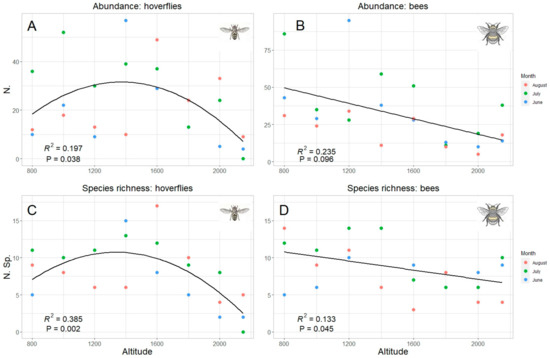 Relation between hoverfly (A,C) and bee (B,D) abundance (A,B) and species richness (C,D) and altitude; only the months with the best fit have been selected, in accordance with the results in Table 2.