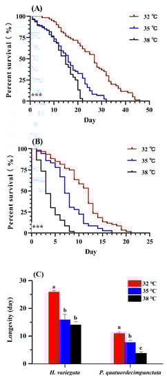 Survival of H. variegata and P. quatuordecimpunctata adults was affected by temperature (log-rank test: χ2 = 64.82, df = 2, p < 0.001; χ2 = 102.69, df = 2, p < 0.001, respectively; Figure 1A,B). At all temperatures, H. variegata attained the highest survival (log-rank test: 32 °C: χ2 = 77.77, df = 1, p < 0.001; 35 °C: χ2 = 43.12, df = 1, p < 0.001; 38 °C: χ2 = 36.36, df = 1, p < 0.001). At 38 °C, P. quatuordecimpunctata survival declined significantly on the 3rd day compared to other temperatures (Tukey’s test: F2, 6 = 252.33, p < 0.001) (Figure 1B). Hence, elevated temperatures negatively impacted P. quatuordecimpunctata more than that of H. variegata.