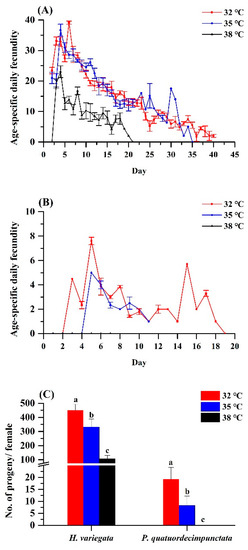 Elevated temperature equally affected age-specific and total fecundity of both ladybug species (Figure 2A,B). For H. variegata, oviposition rates dropped from 450.77 to 332.19 to 107.38 eggs per female as temperatures rose from 32 over 35 to 38 °C (Tukey’s test: F2, 6 = 50.21, p < 0.001). Peak oviposition shifted from day 6 at 32 °C and on day 4 at 35 and 38 °C. For P. quatuordecimpunctata, total oviposition was significantly lower than H. variegata at all temperatures. Oviposition rates of P. quatuordecimpunctata declined from 19.19 (32 °C) to 8.27 (35 °C) to 0 at 38 °C, respectively (Tukey’s test: F2, 6 = 20.70, p = 0.002). For all temperatures, peak oviposition was recorded on day 5 (Figure 2).