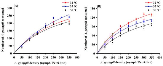 Functional response curves of adult female Hippodamia variegata (A) and Propylaea quatuordecimpunctata (B) to 4th instar Aphis gossypii at different temperatures.
