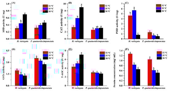 For H. variegata adults held under the three temperatures for 24 h, SOD activity increased at higher temperatures (Tukey’s test: F2, 6 = 102.27, p < 0.001; Figure 4). Similarly, SOD activity of P. quatuordecimpunctata adults progressively increased with temperature (Tukey’s test: F2, 6 = 40.54, p < 0.001) (Figure 4A). CAT activity of H. variegata and P. quatuordecimpunctata adults also increased steadily with temperature (Tukey’s test: F2, 6 = 162.45, p < 0.001; F2, 6 = 6.56, p = 0.031, respectively) (Figure 4B). POD activity of H. variegata increased at 35 °C but then decreased by 82.6% at 38 °C (Tukey’s test: F2, 6 = 141.97, p < 0.001). Meanwhile, for P. quatuordecimpunctata, POD activity progressively decreased at higher temperatures (Tukey’s test: F2, 6 = 106.66, p < 0.001) (Figure 4C). For both ladybug species, GSTs activity consistently declined at higher temperatures (Tukey’s test: F2, 6 = 58.38, p < 0.001; F2, 6 = 35.91, p < 0.001) (Figure 4D). The T-AOC activity levels in the two ladybug adults were significantly affected by treatment temperatures. While the T-AOC activity of H. variegata increased with temperature (Tukey’s test: F2, 6 = 131.26, p < 0.001), it only declined at 38 °C for P. quatuordecimpunctata (Tukey’s test: F2, 6 = 9.94, p = 0.012) (Figure 4E). Lastly, heat stress negatively affected protein concentration in both ladybug species (Tukey’s test: F2, 6 = 457.49, p < 0.001; F2, 6 = 80.78, p < 0.001) (Figure 4F).