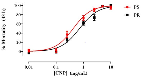 Concentration-response curves for acute toxicity (48 h) of E1800 against 1st instar Ae. aegypti of representative pyrethroid-susceptible (PS, red) and pyrethroid-resistant (PR, black) strains. Values plotted are means ± standard errors of the mean based on 12 replicates of 5 larvae per concentration (Control average PS: 2.5%; PR: 3.87%). The median lethal concentration (LC50) value of the PR strain (0.72 mg/mL) was significantly greater (F-test, p < 0.001) than that of the PS strain (0.42 mg/mL) as determined using a nonlinear regression fit and a F-Test (p < 0.001). Mortality values were corrected using Abbott´s formula [40].