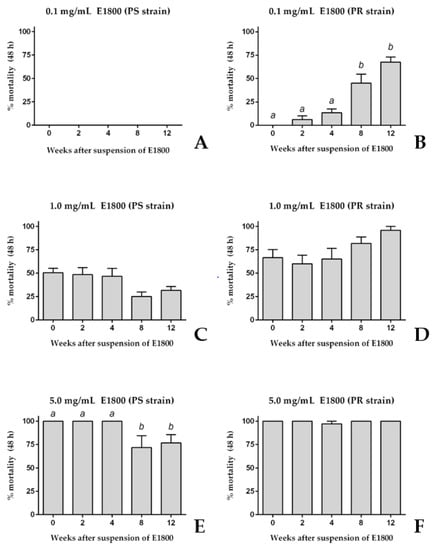 Higher concentrations of E1800 showed less remarkable changes in toxicity over time. Similar to the results of Figure 1, a freshly prepared suspension of 1.0 mg/mL E1800 induced ~50% mortality in both the PS and PR strains (Figure 2C,D); the toxicity of this suspension did not significantly change over the remaining 12-week period (Figure 2C,D). Furthermore, similar to the results of Figure 1, a freshly prepared suspension of 5.0 mg/mL E1800 induced ~100% mortality in both the PS and PR strains (Figure 2E,F); the toxicity of this suspension against the PS strain was similar within 4 weeks after suspension, but significantly decreased to ~75% mortality at weeks 8 and 12 after suspension (Figure 2E). On the other hand, the toxicity of this suspension did not significantly change in the PR strain in the remaining 12-week period (Figure 2F).