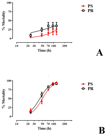 In the presence of 0.25 mg/mL E1800, larval mortality progressively increased every 24 h for the first 120 h in both the PS and PR strains, reaching 90–95% mortality (Figure 3B). The LT50 of the PR strain (42.5 h, 38.7–46.6 h 95% CI) was significantly lower (F test, p < 0.05) than that of the PS strain (50.1 h, 45.9–54.6 h 95% CI), indicating that, in this assay, larvae of the PR strain are slightly more susceptible to E1800 than those of the PS strain. The larvae that survived this treatment continued development to adults in a similar fashion as controls (Figure S1).