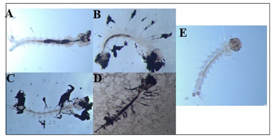 Dead Ae. aegypti larvae exposed to (A) 0.1 mg/mL or (B–D) 0.25 mg/mL E1800. For comparison, a control larva is shown in panel (E). Accumulation of black material is observed internally (midgut, head/mouthparts) and externally (setae, anal papillae) in the larval body. Larvae were observed under an Olympus SZ6145TR Stereo Microscope at a magnification of 25× and images were captured with a GO3 Digital Color Camera.